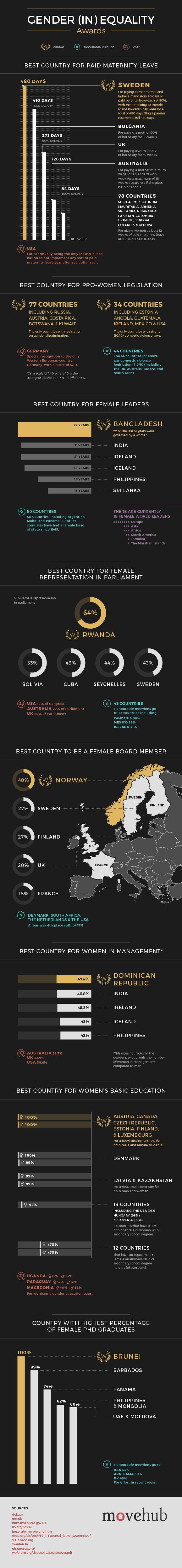 In the lead up to International Women’s Day on 8 March, and since it is awards season, MoveHub researched the best countries for women and displayed our data in our first annual Gender (In)Equality Awards.